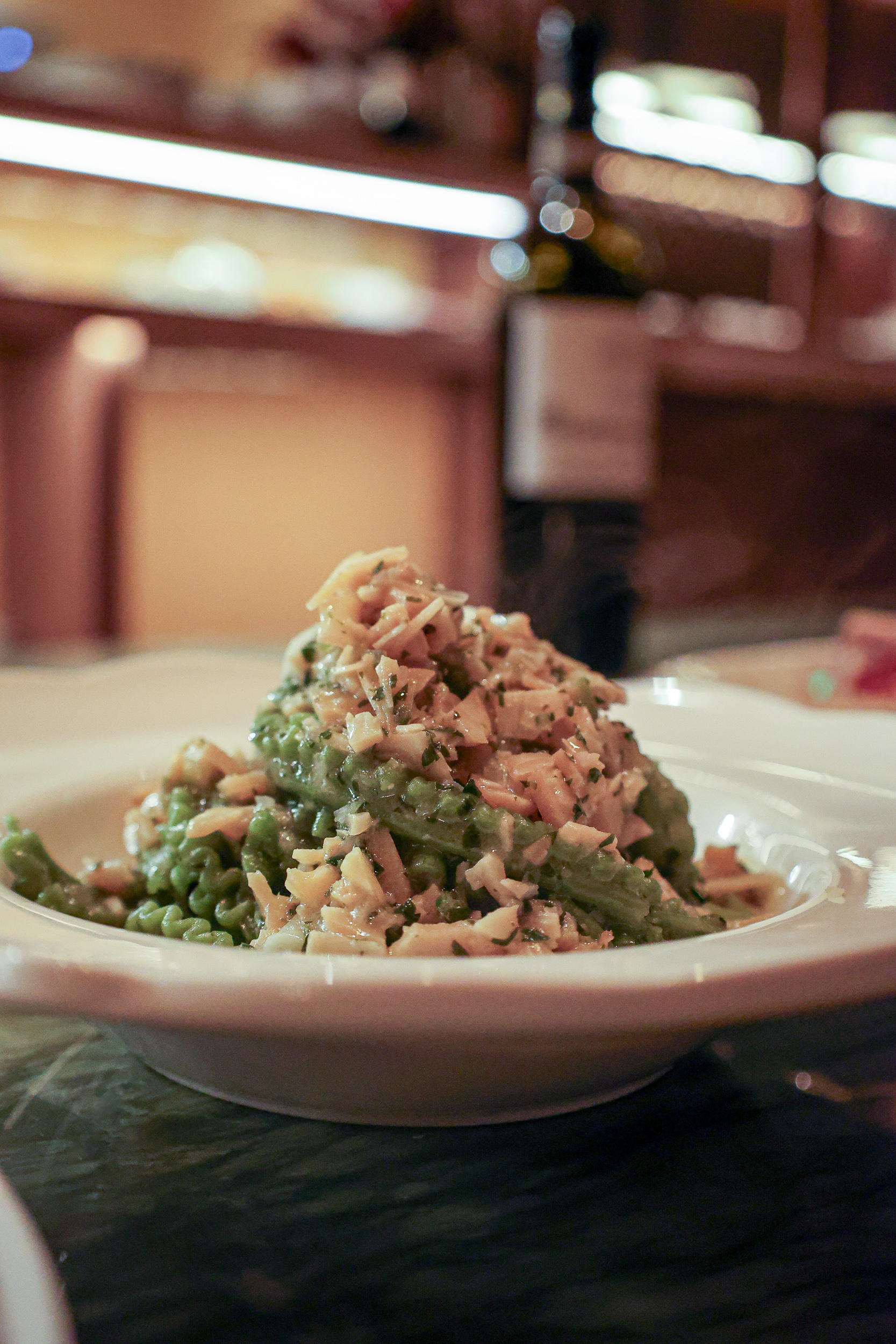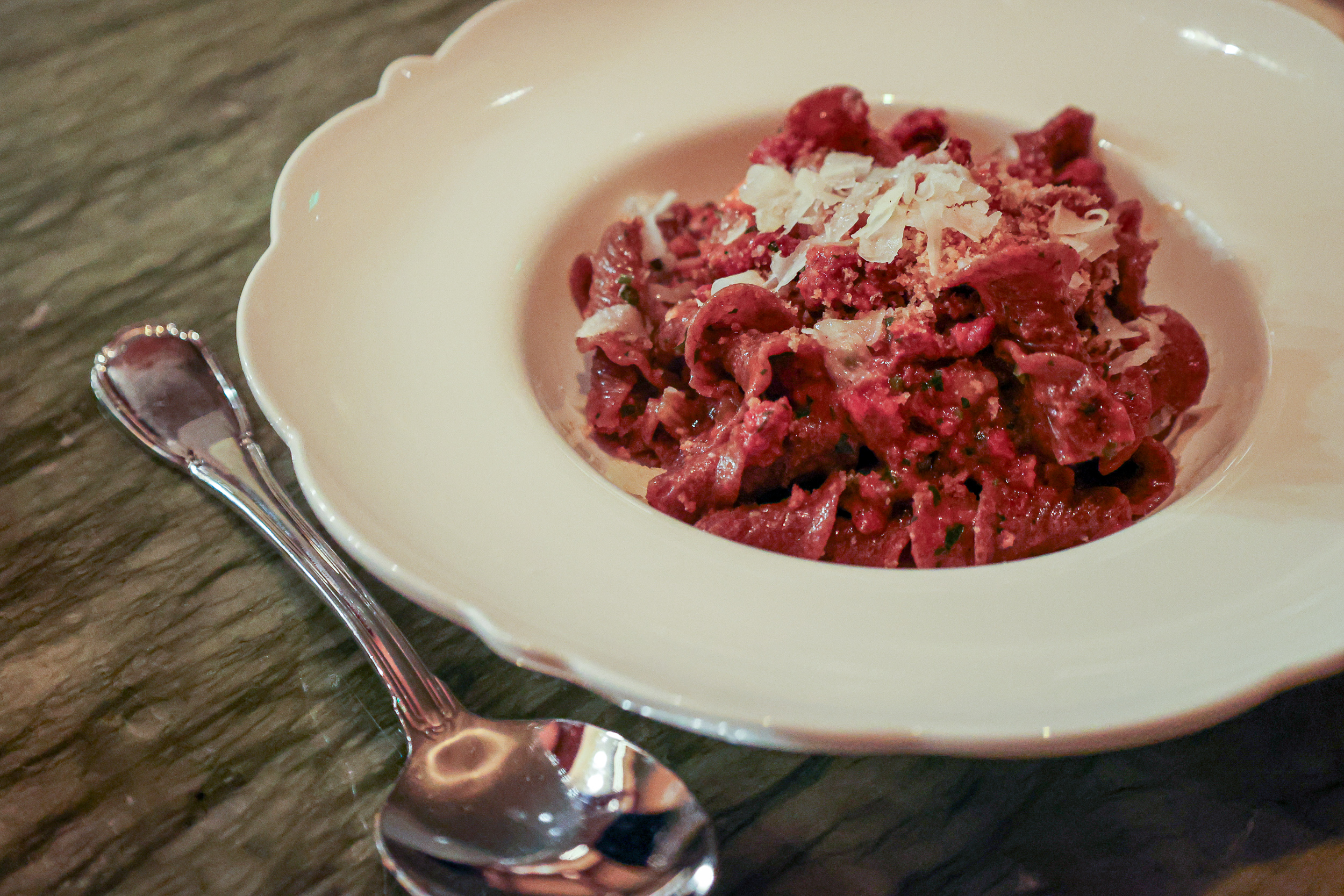 Main dishes aren’t usually on our radar at an Italian restaurant (saving room for pasta, obviously), but our server insisted on the Denver Steak, and we’re glad he did. Perfectly cooked, the steak arrived sliced with turnips and finished off tableside with bone marrow salsa verde. It all made for a really juicy and tender piece of meat.