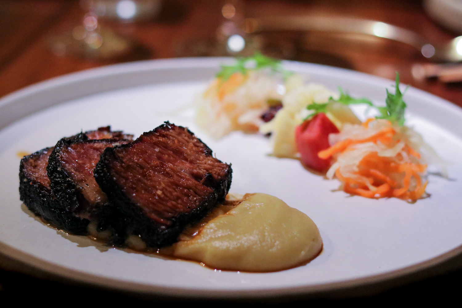 Second course features two rice and two entrée options. Go with a date and try them all, which include palate dropping Wild Mushroom Koshihikari rice with aioli, pickled onions and bitter greens for good measure and texture; Pork Adobo ginger jasmine rice with cilantro, dried shrimp, green mango pico, and a fried duck egg on it; melt-in-your-mouth smoked 72-hour Wagyu Short Rib Asado with seasonal pickles and a velvety and heavenly sweet potato puree; and cooked-to-flawless-perfection Market Fish with cilantro, chile patis, atchara, and garlic-ginger rice just in case the other rice dishes weren’t enough.