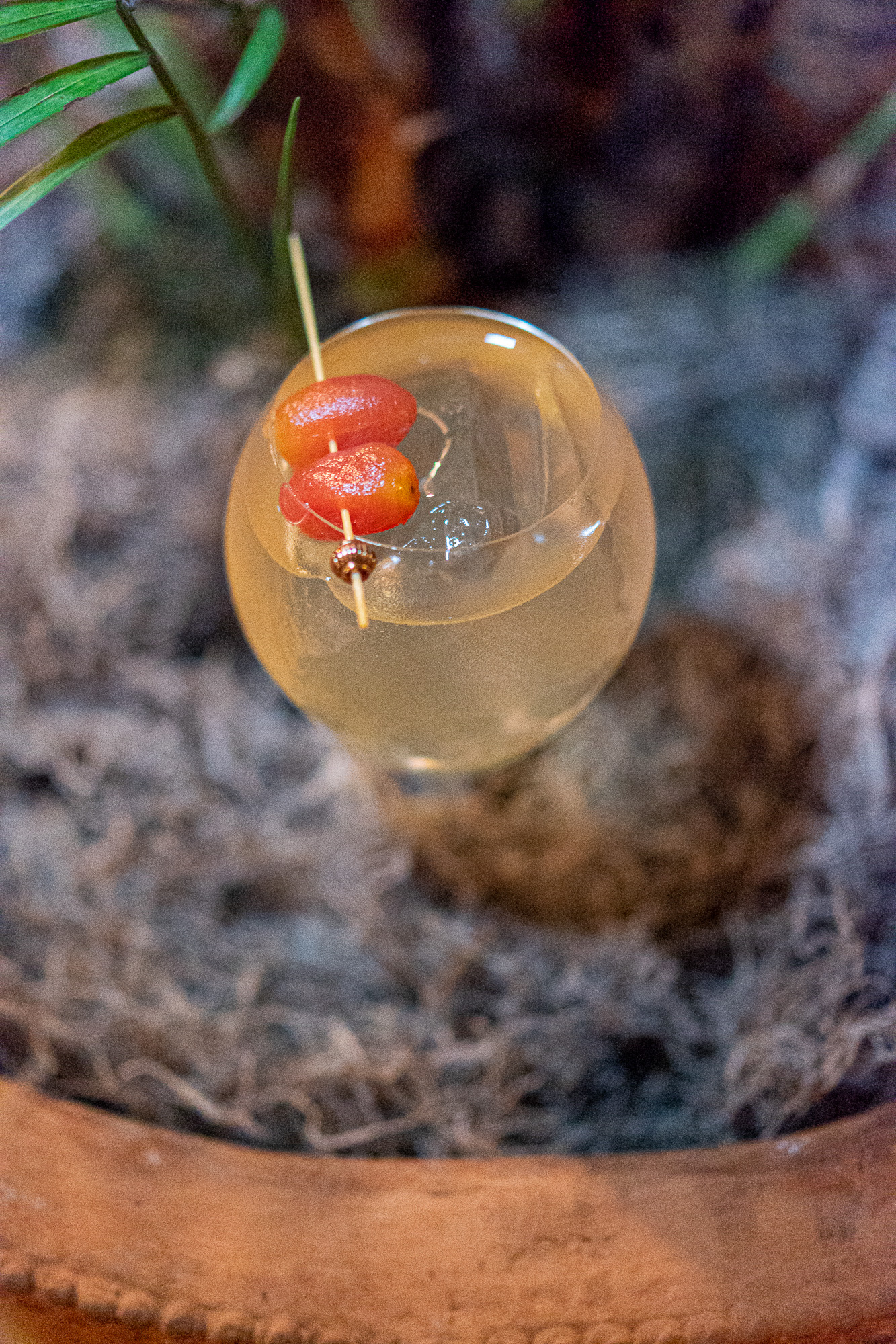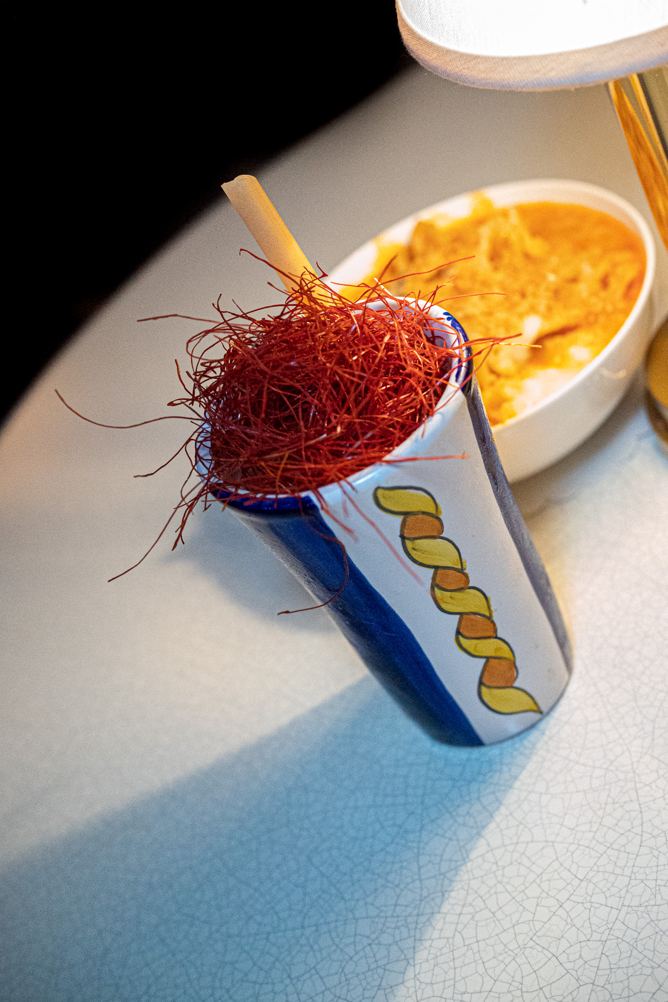 This cocktail is made with Absolut Elyx, salted Pernod, wheat orgeat and tropical sherbet served in a custom painted pasta glass with a thick pasta straw, topped with chili threads.