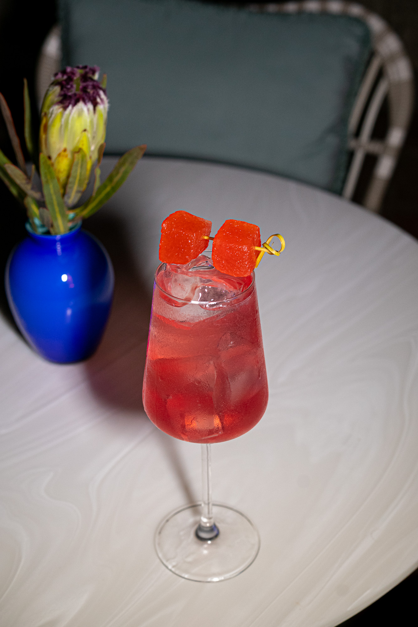 Imagine a summery rose cocktail made with Gra`it Grappa, Cocchi Rosa, pomace & tannins, fresh watermelon, topped with soda.