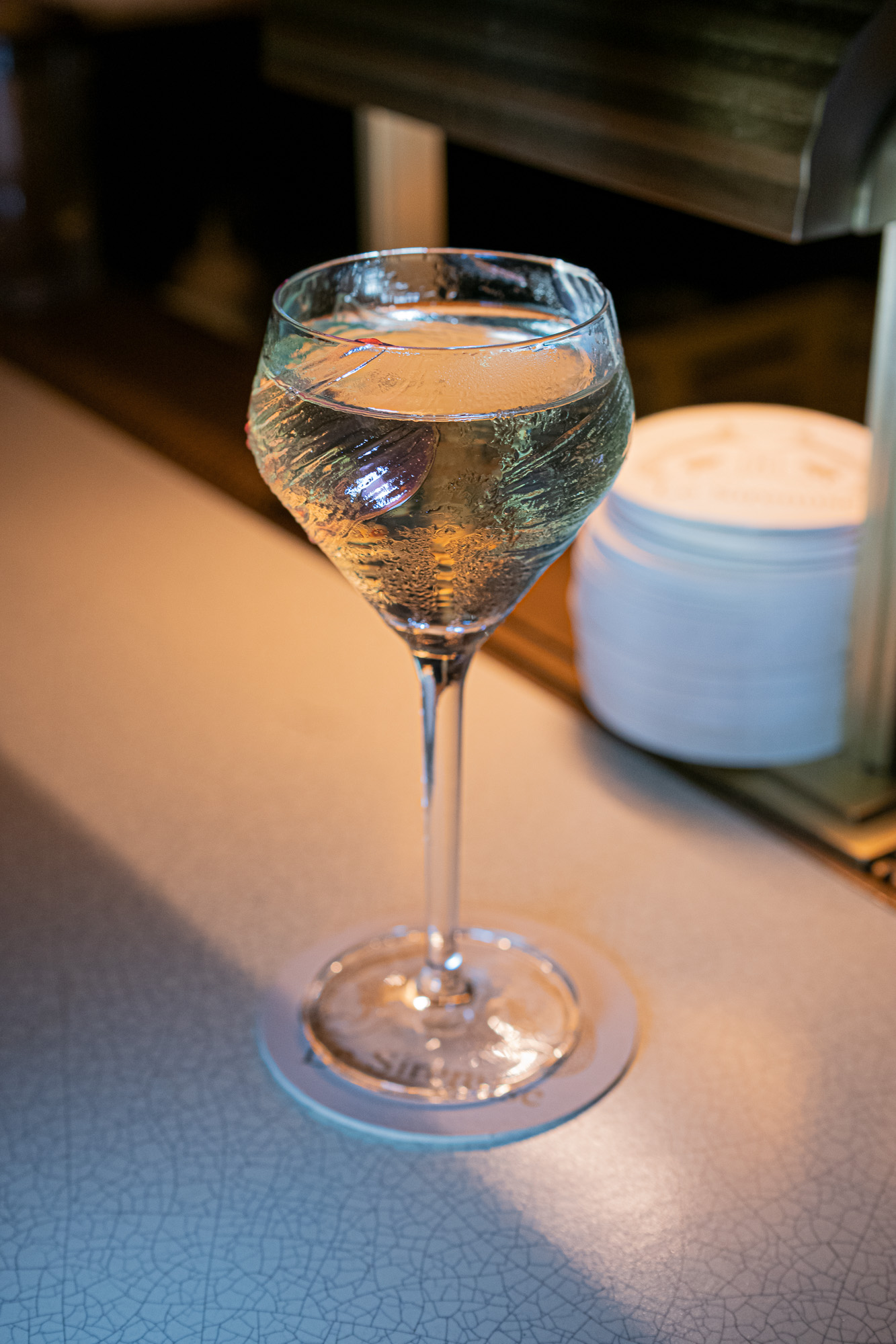 A fun play on a martini, this cocktail is made with Tanqueray 10, Cocchi Americano, Tio Pepe, and three types of edible artistic paint decorating the glass in the green, white, and red of the Italian flag creating a different experience with each sip as it goes from a dirty martini, to a 50/50, to a Martinez.