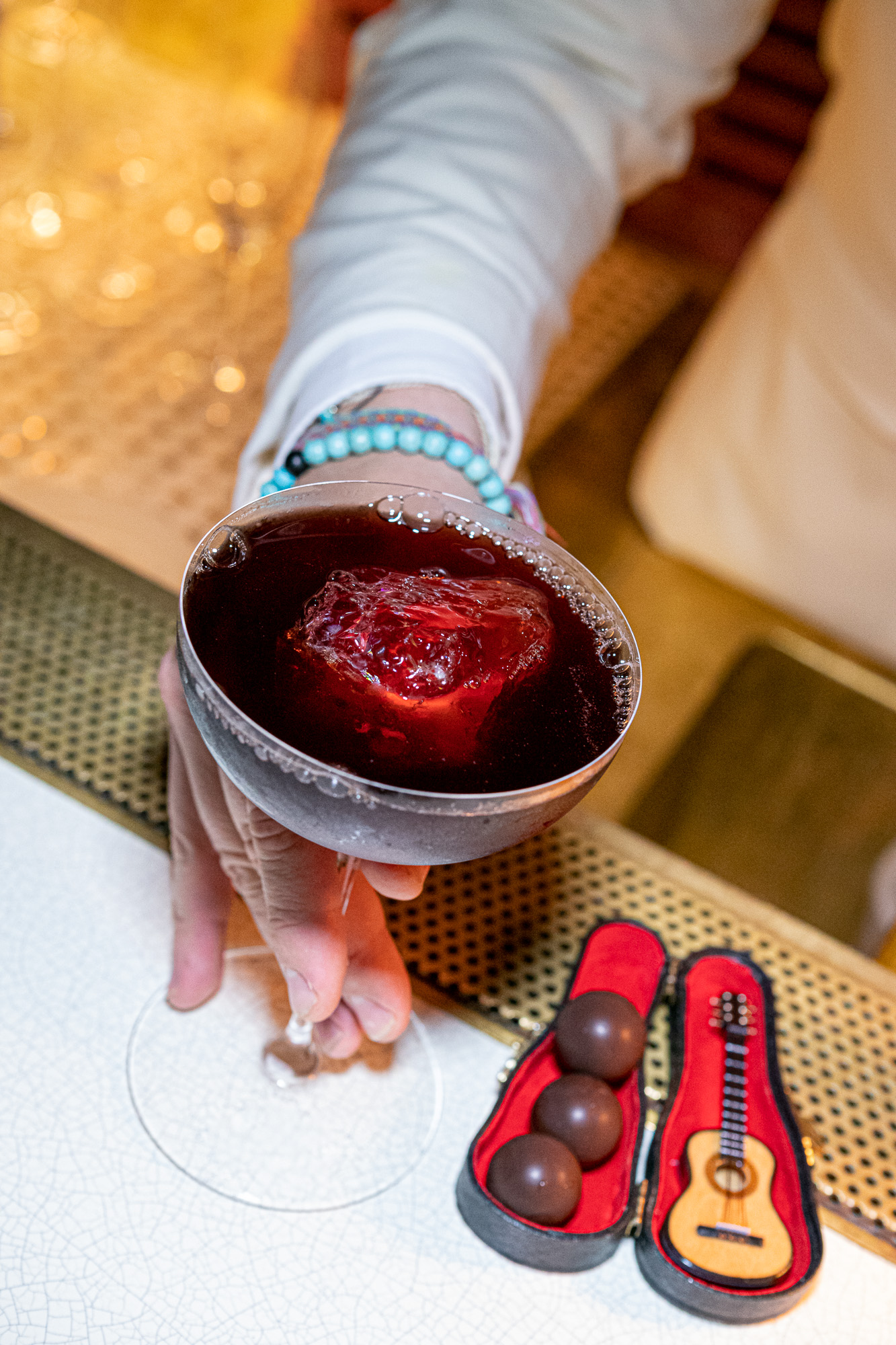 Affectionately known as The Musician, this take on a Manhattan is made with Bulleit Bourbon, Mancino Vermouth Chinato, Martini Bitter, banana and coffee and is served with a tiny guitar and a handmade truffle filled with the cocktail.