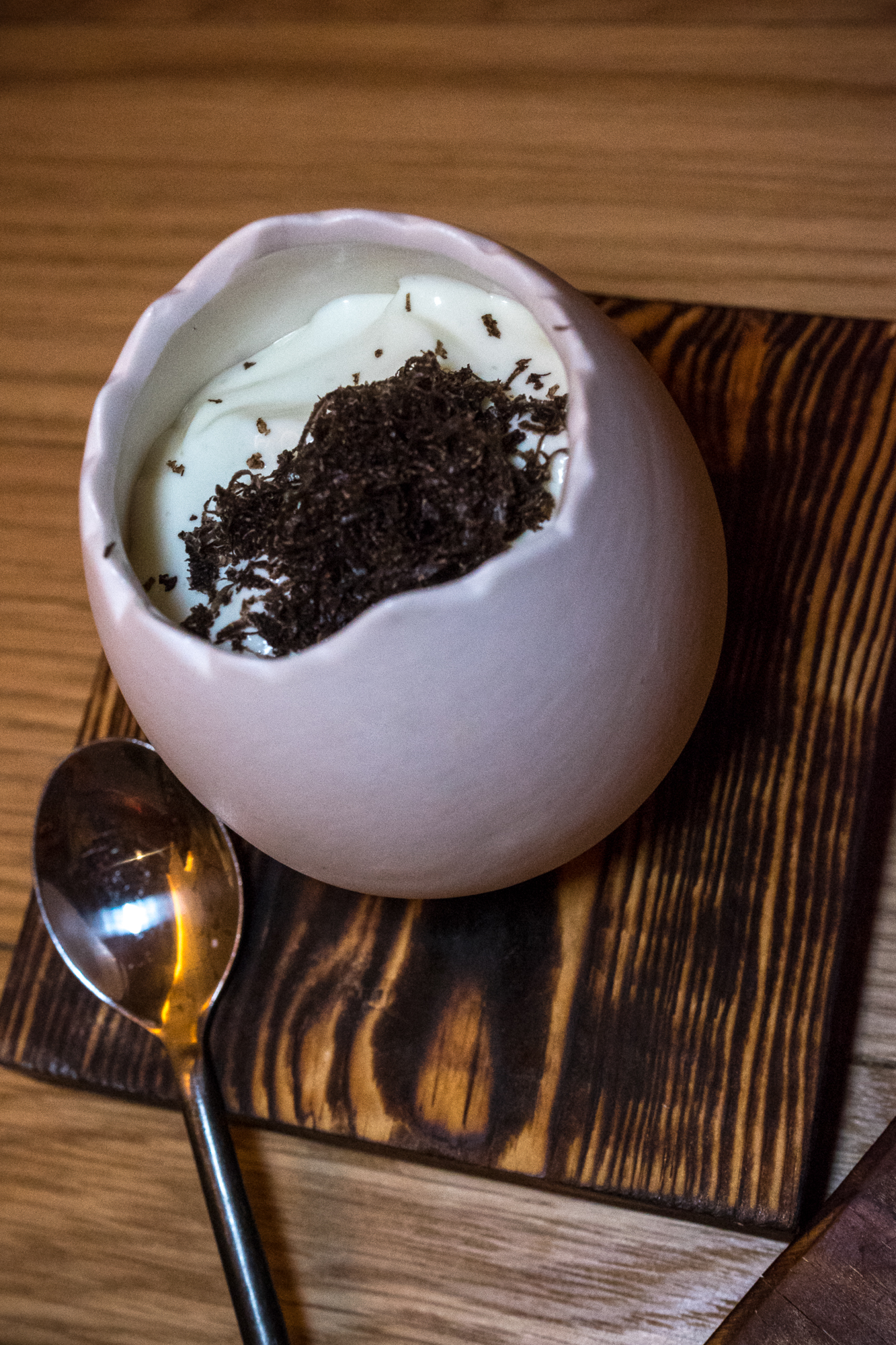 Just when we though we couldn’t eat anymore, the dessert cart of Petit Fours arrived and it was time to devour some sweets by the ever so sweet and talented Maria Orantes. Along with the confections on the cart like chocolates and macarons, we also devoured the Apple Pie Ningyo-Yaki, which are basically apple pie poppers, along with the Barba-Papa made with ginger cremeux, various pineapple “textures” and coconut foam, along with the seasonal Bread Pudding made with sweet potato custard, caramelized miso, chai tea, vanilla and black sesame.