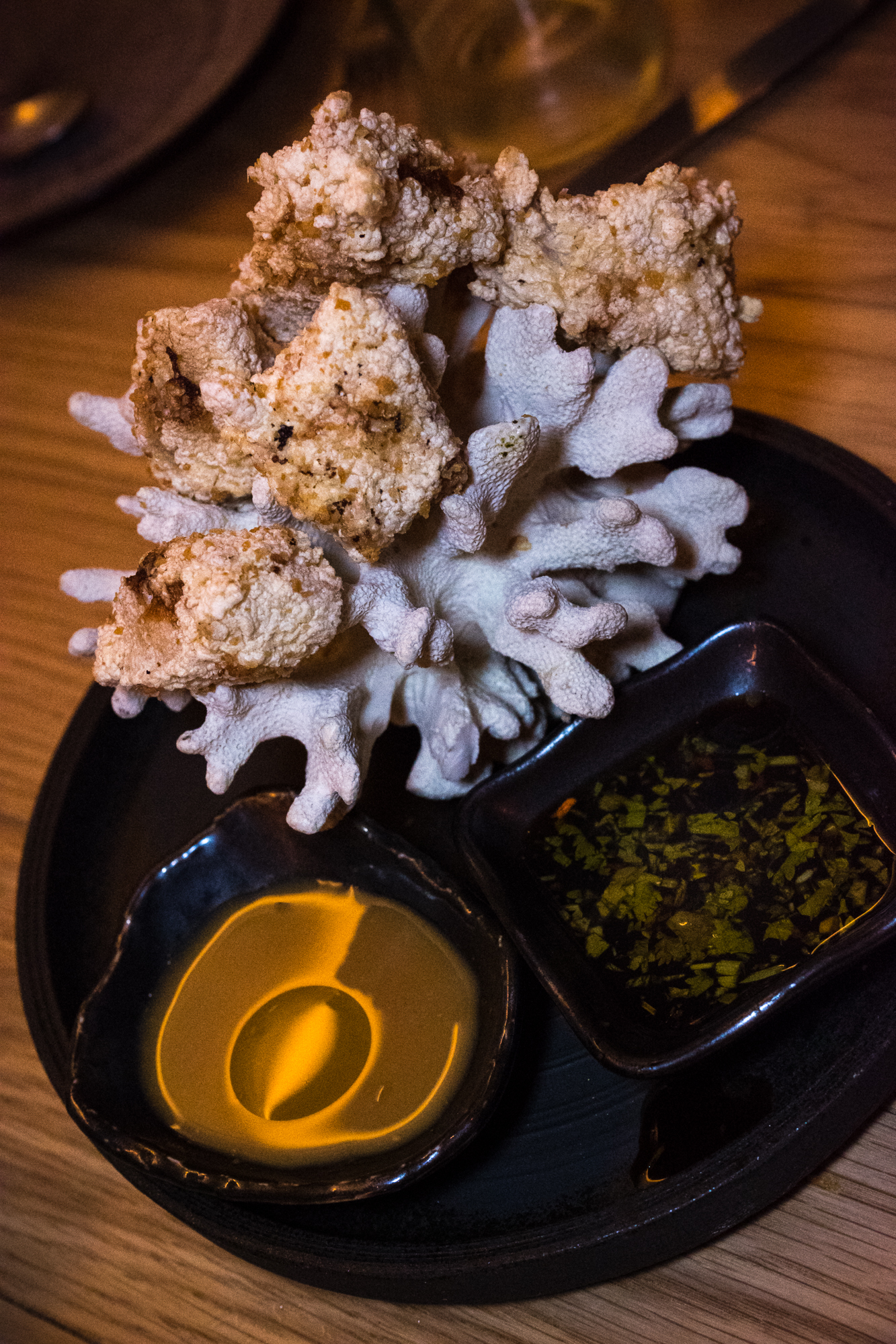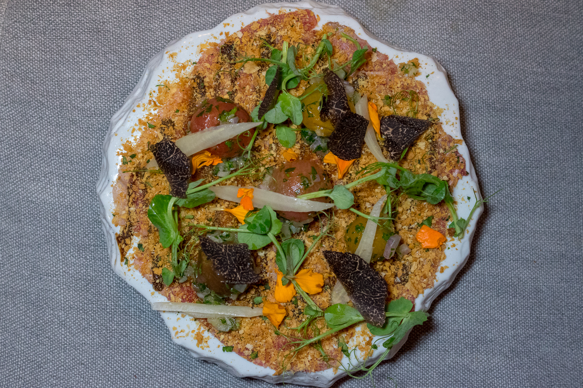 We started the meal off on a light note with the a few seafood dishes like the Cobia Sashimi with brown butter soy, samphire, lime and “sea water” along with the Hamachi Aguachiles with watermelon, guajillio, radishes and cilantro. Those dishes were then followed by a standout Burrata dish that is grilled and topped with pumpkin and brown butter along with the almost too pretty to eat Wagyu Beef Tartare with creme fraiche, raspberries, and pistachios along with the Miami appropriate Yellowtail Snapper “Chicharrónes.” Yes, you read that correctly.