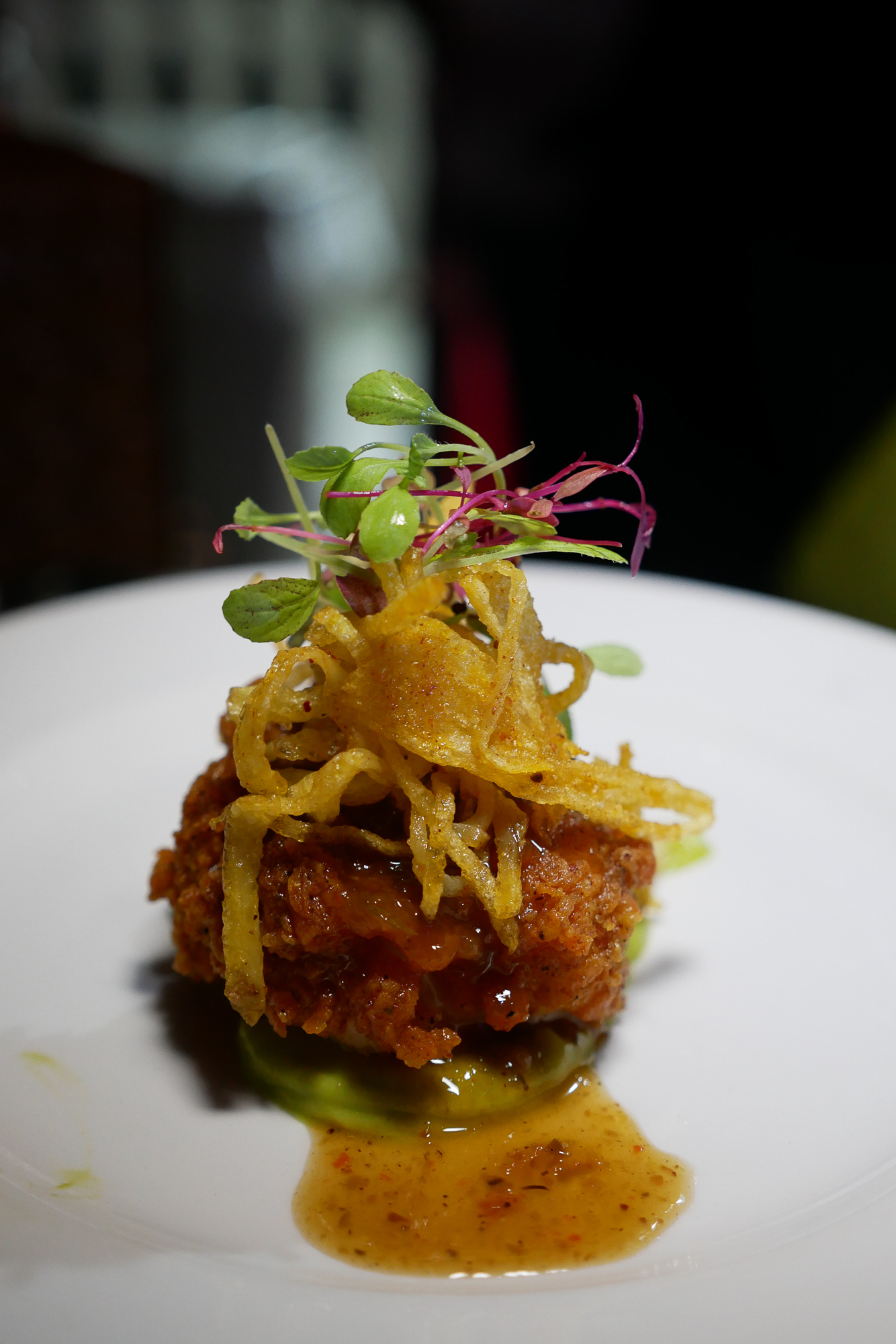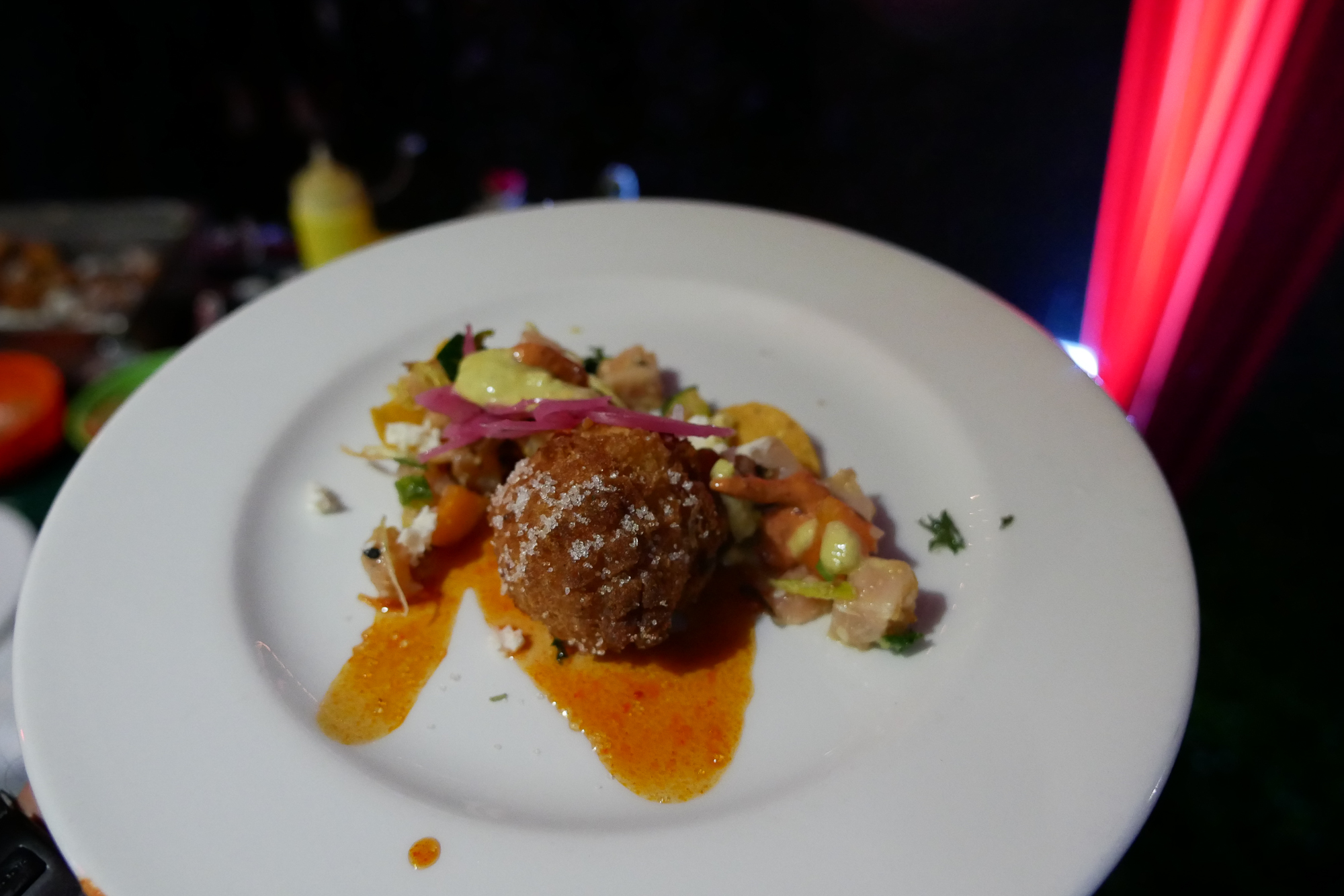 On Thursday evening, our first stop was Crisp, which was dedicated to all things crispy — think crispy pork skin, pan fried tenderloin or jerk fried chicken dishes all paired with crisp, delicious, ice cold local and international beers. Some of our favorites were the Beer Margaritas with Sauza Tequila, Smoked Marlin Tostaditas with Sweet Corn Beignets, and Popcorn Shrimp with Beer & Korean Popcorn. It was a great way to kick off the weekend with a fun DJ spinning tunes mixing reggae with hip-hop.