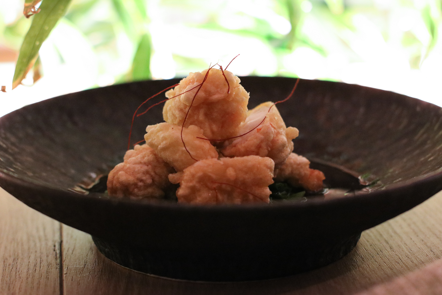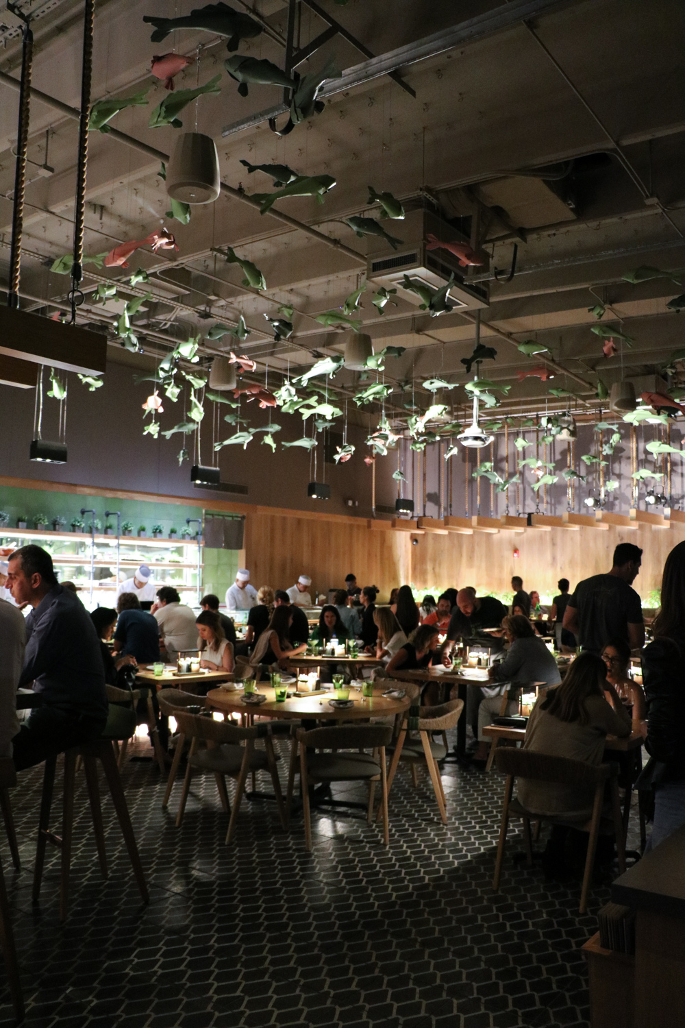 Like its sister restaurant Juvia, Sushi Garage was also designed by Alejandro Barrios, who won The James Beard Foundation Design Award for Juvia in 2013. Beyond the garage door entrance, Alberto Cavalieri Koi fish sculptures dangle from the ceiling and handcrafted tiles dress the floor.