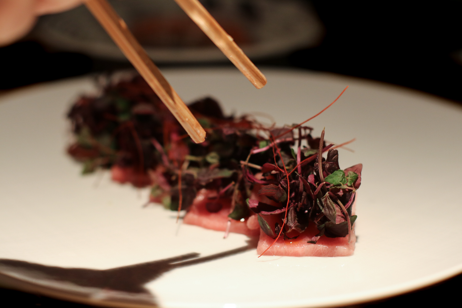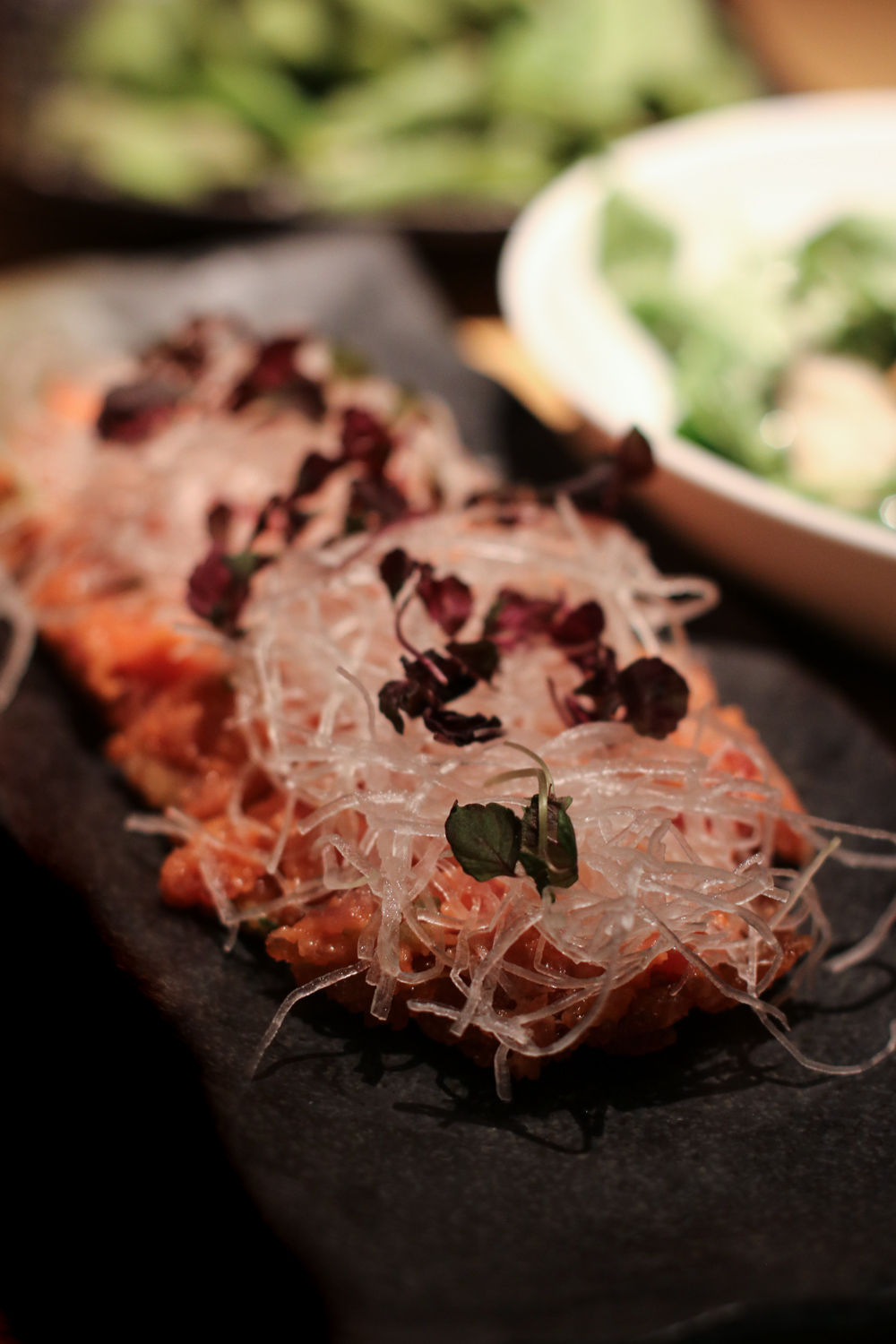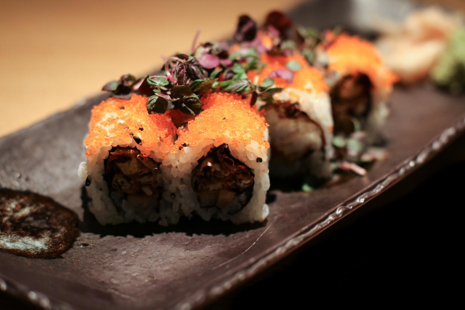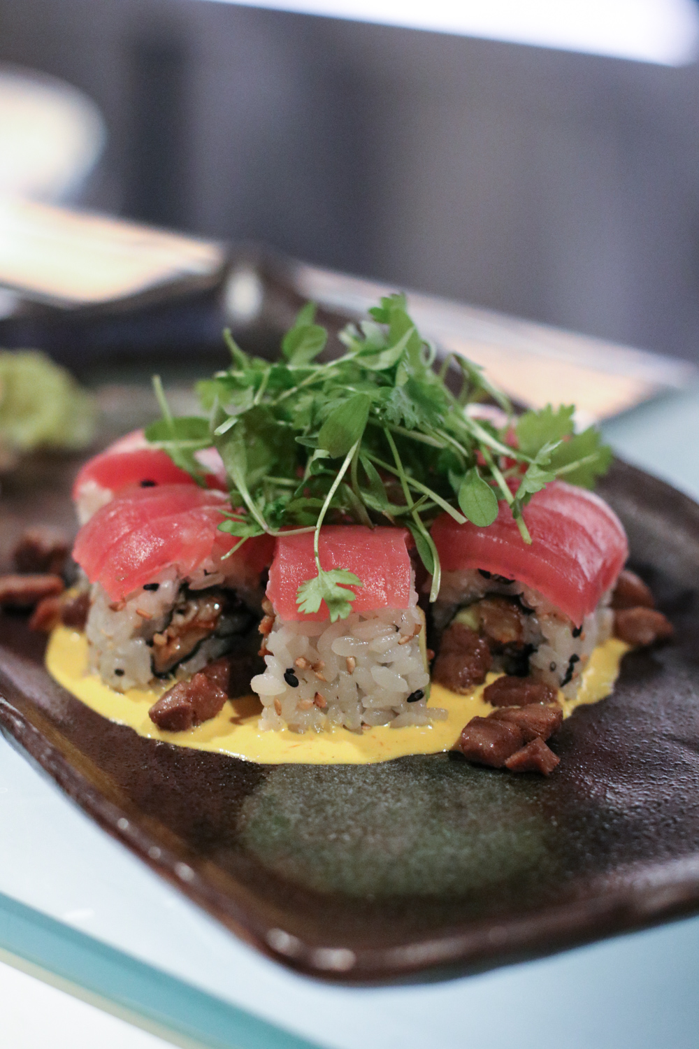 The menu is an ode to classic Japanese techniques and flavors created by Oh. Sushi Garage offers a number of hot and cold appetizers, sushi rolls, hand rolls and other Japanese classics. Highlights from the appetizers Kampachi Yuzu with Cilantro Salt Tiradito, Spicy Tuna Crispy Rice, Dumpling Soup, Watercress Hop Salad and the King Crab Tempura Nan Ban. Specialty nigiri by the pair certainly can’t be missed with options like Truffle Shitake, Toro Gunkan Red Shiso and Wagyu Black-Garlic being favorites. Fresh rolls like the Tuna Chicharrón and the Maryland Softshell Crab along with the Fried Rice Stone Pot prepared right in front of us rounded out the meal.