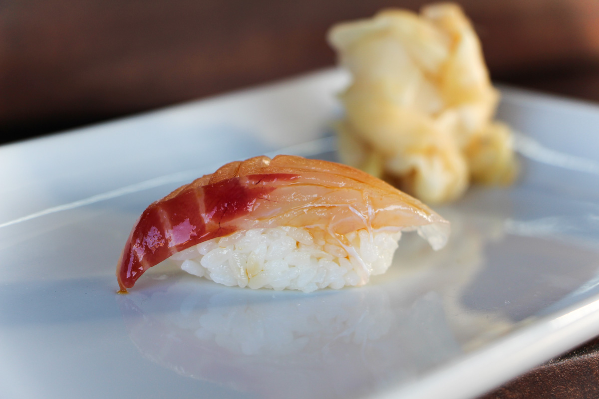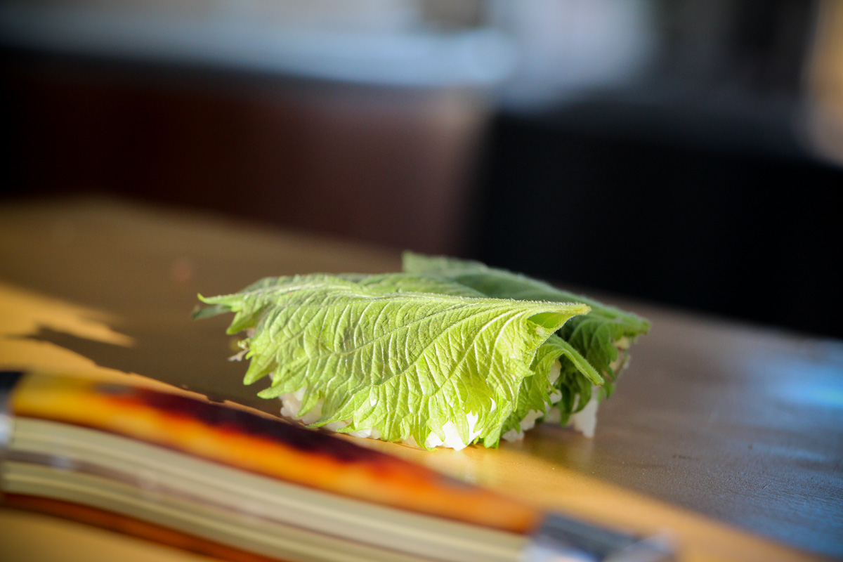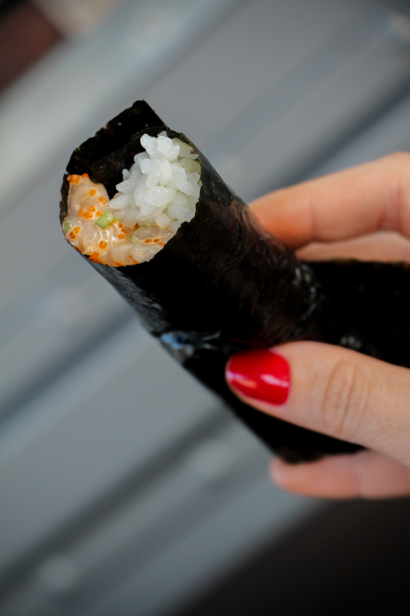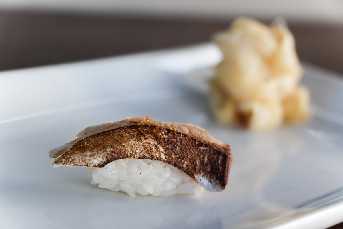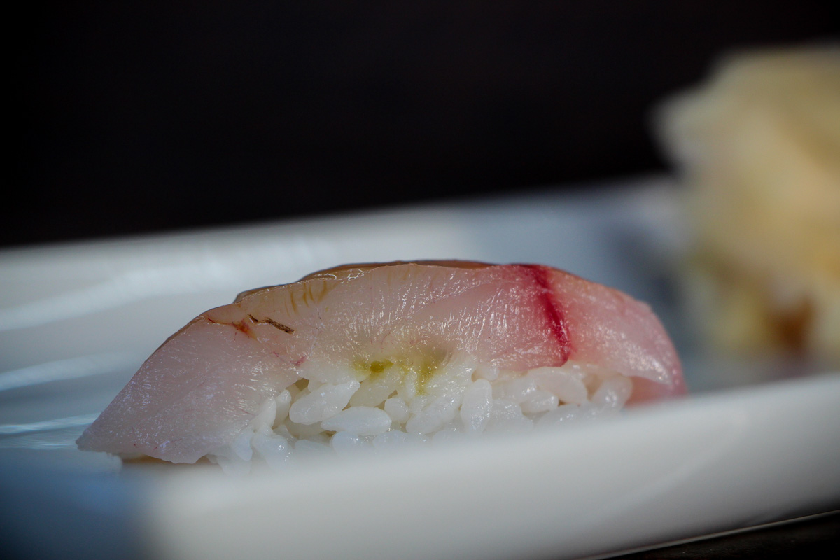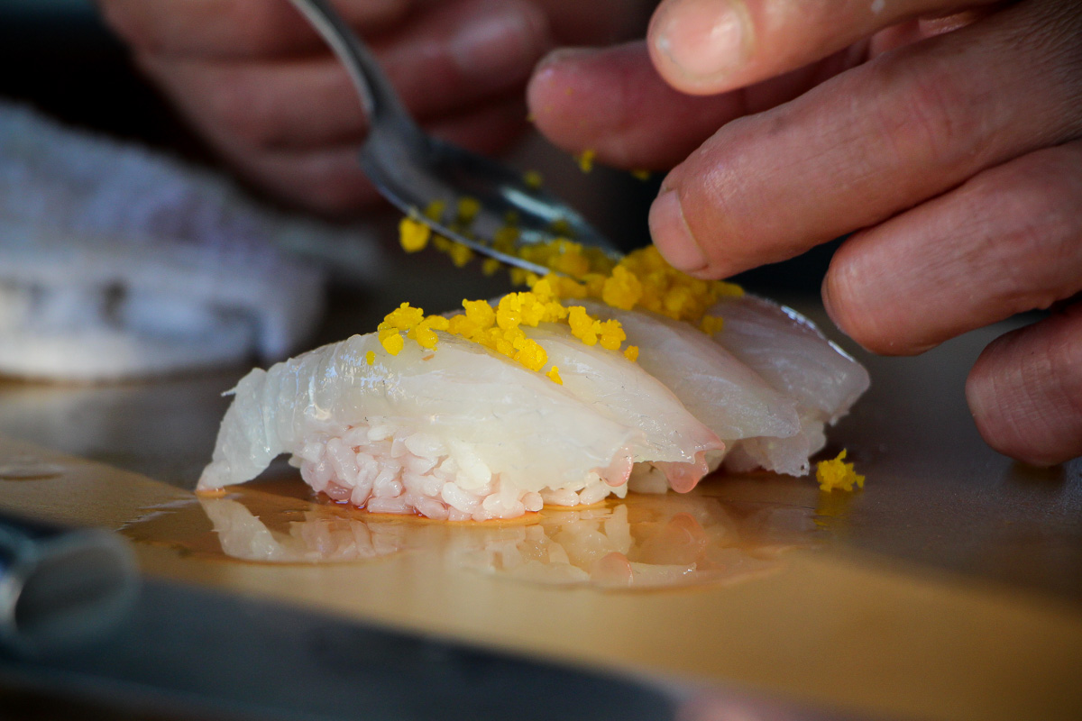 During our meal we got to try traditional nigiri pieces topped with fish like amberjack, toro, sea urchin, pompano and sea scallop, along with signature nigiri of Yoshida’s topped with items like horse mackerel, ginger and scallions; fluke with flambeed sake and egg yolk; red snapper with shisho leaves, sautéed plum and sesame; seared-on-the-spot bluefin toro that melts in your mouth and a hand-roll overflowing with spicy scallops. The fish that is served is brought in from both the Atlantic and Pacific waters, with the menu changing daily based on availability and season.