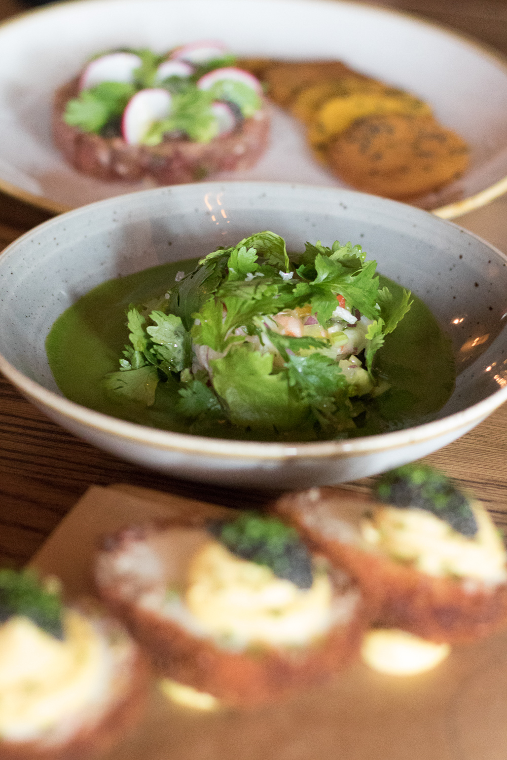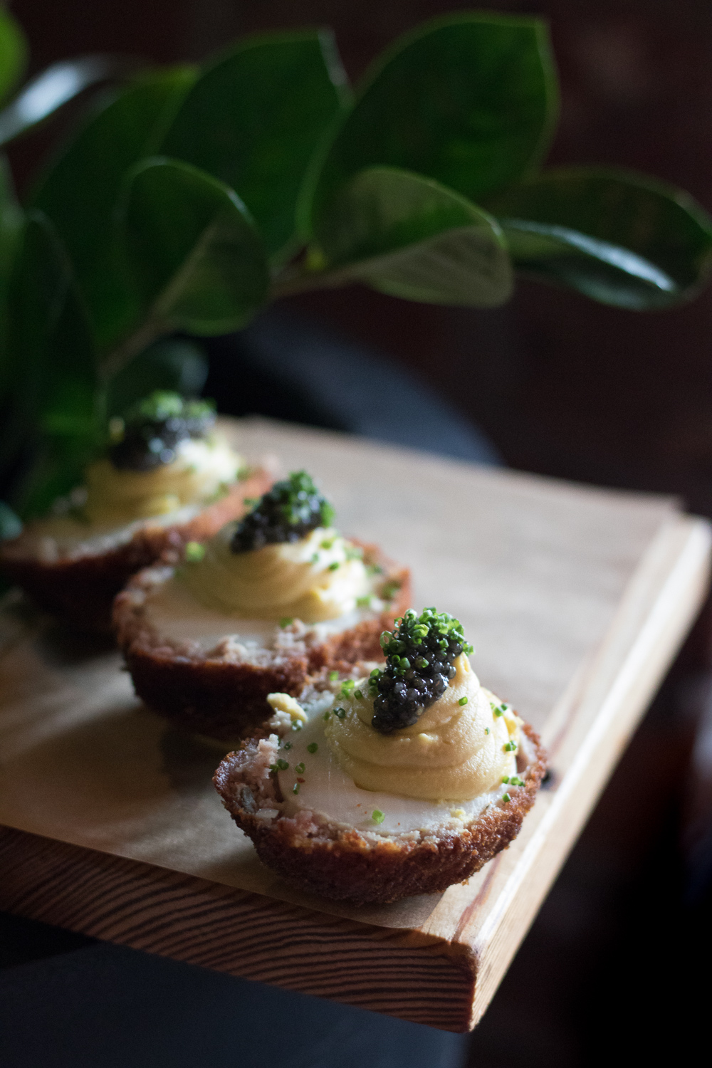 Our meal started with Charcuterie that would make all other boards jealous (there were head cheese croquettes and dense yet airy foie and chicken liver mousse), and went only up from there. Mouthwatering cold smoked Tuna Tartare with avocado and crispy bananas was a seamless balance of fatty, flesh, and crunch. Shrimp marinated in a robust and bright green roasted jalapeno jus was an explosion of zest and subtle but resilient heat. Scotch Deviled Eggs will never be the same thanks Compton’s off-menu twist on the rife classic that had our entire table in awe and savoring every bite.