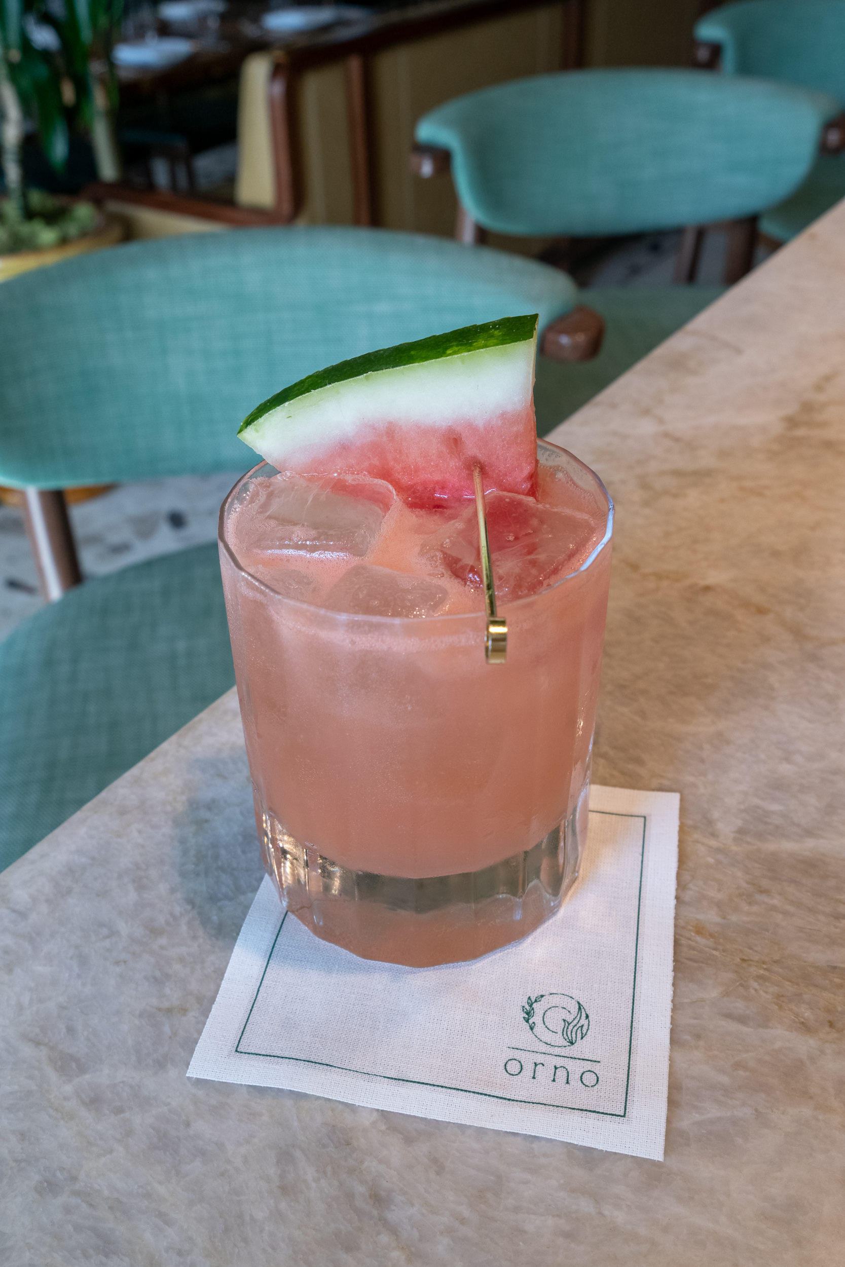 Of course, you can’t go wrong with the classics: Orno’s Bloody Mary was so fresh you may not be wrong in assuming the tomato juice was squeezed from Rancho Patel’s heirlooms. Their Mo’garita is a spicy marg that’ll kick start your morning into high gear, and their version of an espresso martini, La Roma, is a near perfect hazelnut and mezcal riff that’s served in an arresting goblet and is a nice way to cap out the entire experience. But as brunch eases into dessert, here’s a pro tip for Chat Chow readers: Order the Bananas in Havana, which is new on the menu. Similar in texture to a grasshopper, this cocktail is so creamy you won’t realize it’s whipped up with a boozy trinity of Havana Club rum, Montenegro amaro and absinthe.