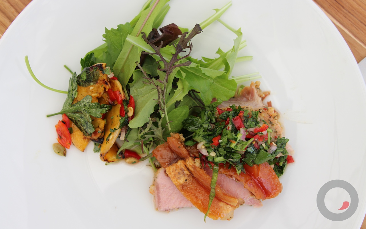 Next on the menu was a porchetta served with a warm salad of roasted butternut squash, local greens and pickled red pepper salsa. Porchetta is a traditional Italian pork roast where a pork loin is wrapped inside of a pork belly. Brooks brined the Berkshire pork loin in a mixture of honey, salt, garlic and fresh herbs, and let it sit overnight. However for the pork belly, he didn’t brine it but let it sit uncovered in the fridge overnight to dry out the meat, helping to create that sought after crispy crust. Before wrapping the two pieces together he seasoned them liberally with herbs from the garden, panko bread crumbs, lemon zest, and then loosely tied everything together.
