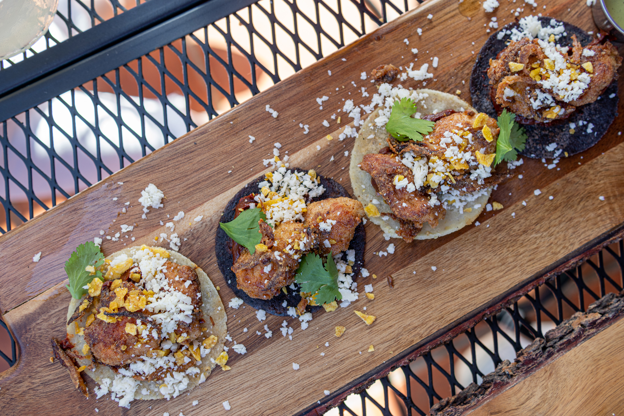 Heartier dishes included the almost meat-like Roasted Mushrooms, which we the hit of the table, and topped with goat cheese and house hot-sauce. Bite-sized Tacos filled with barbacoa, roasted mushrooms, or chicken, were also a crowd pleaser and would be easy to eat in both a social setting and during a seated meal.