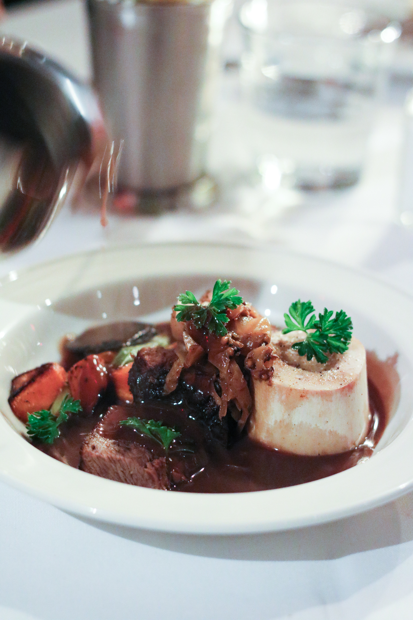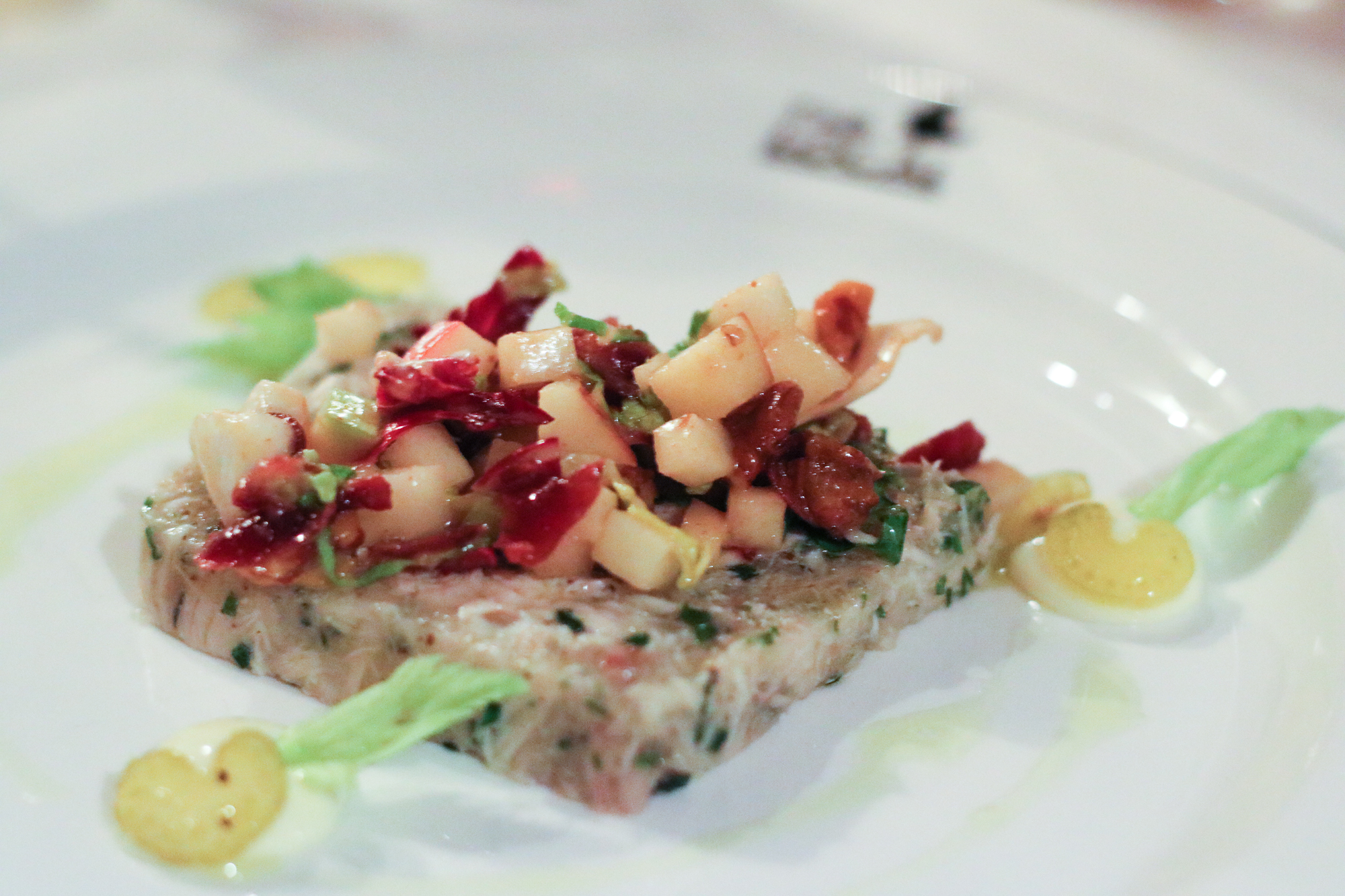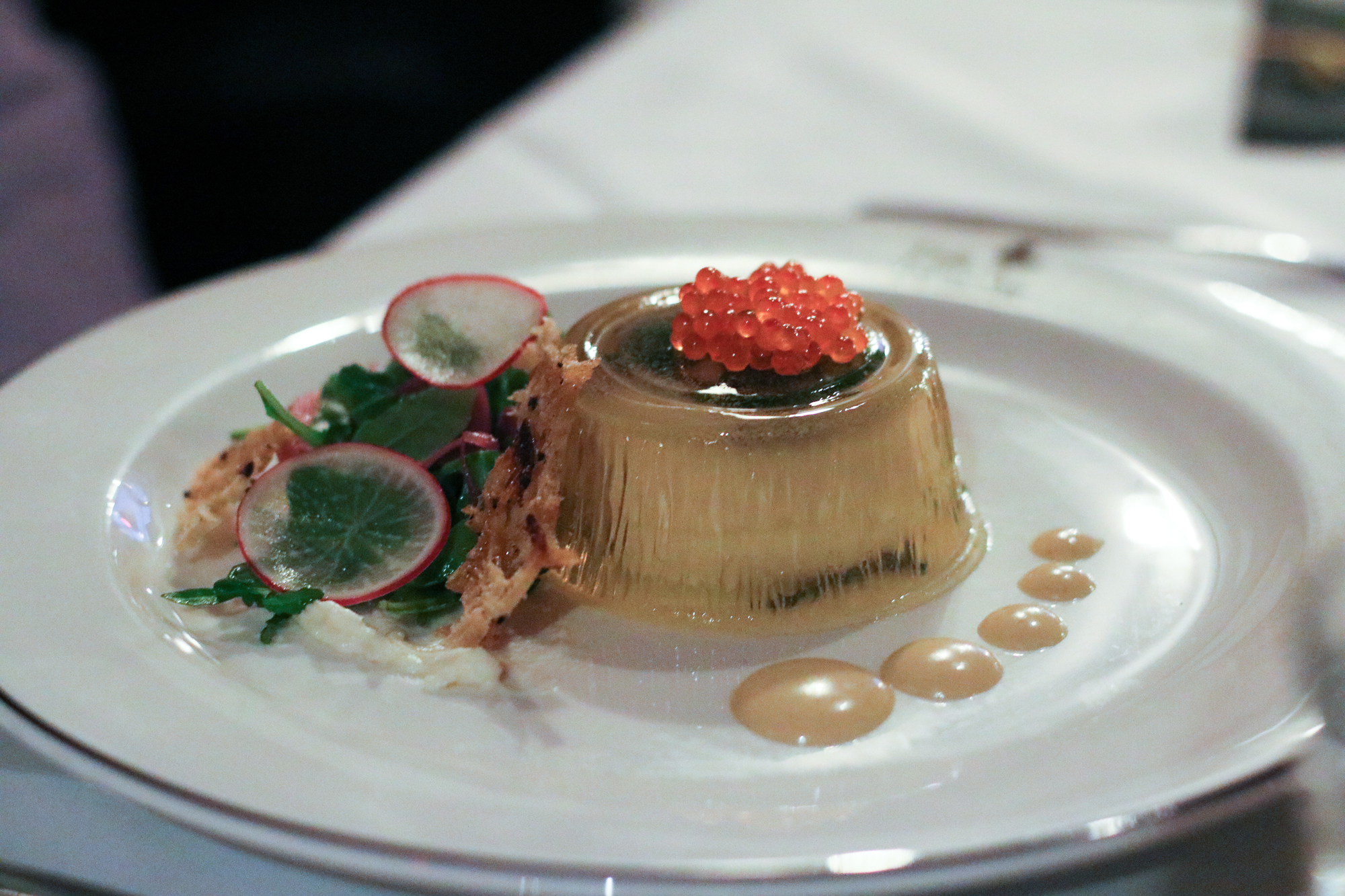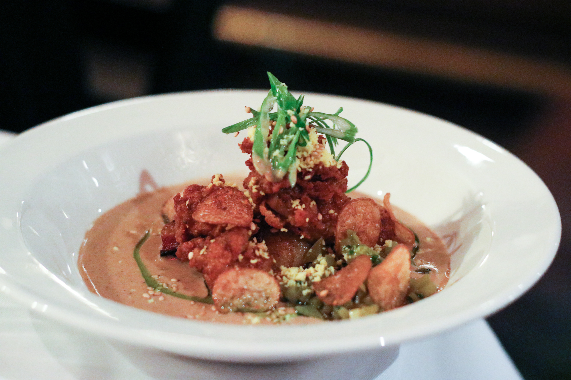 Once everyone took their seat, it was time to begin the feast. First up was a Oeufs en Gelѐe with Smoked Trout Roe & Bourbon Crème Fraiche filled with an egg inside, paired with Coney Island cocktail made with Basil Hayden’s® Bourbon, Cotton Candy Dry Vermouth, Grenadine, Lemon, Orange Bitters. Next up was one of the favorite dishes of the evening a Bourbon-Spiked Brown Oyster Stew with filled Crispy Oysters, Benne, Potato and Pork Belly Tasso. That dish was paired with the boozy Capone’s Tail made with Knob Creek®, Allspice Dram, Lime Juice, Demerara Sugar and Bitters.